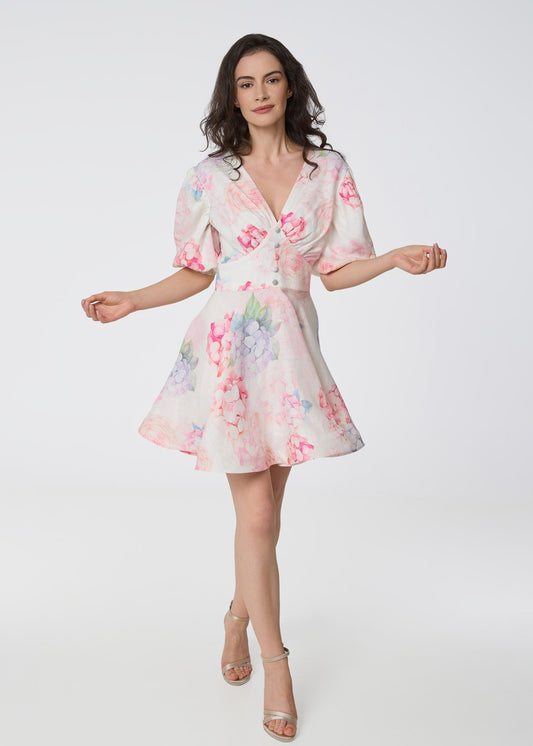Elysian Grace Linen Midi Dress – Blue Hydrangea Print