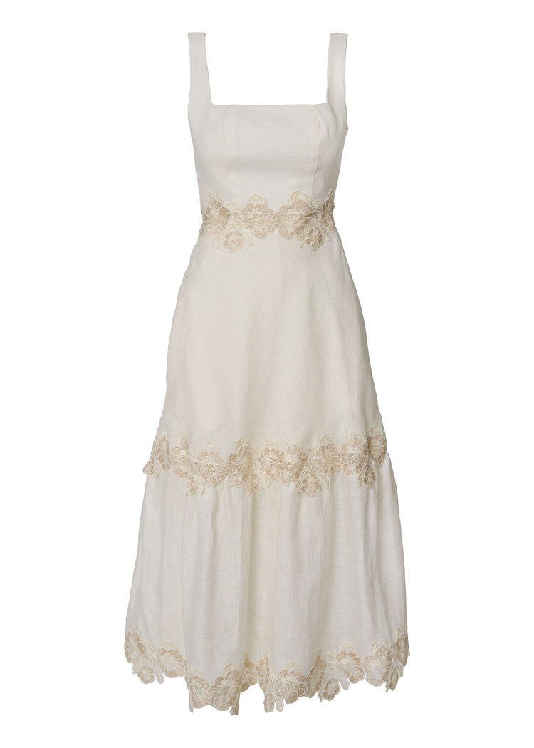 - A sophisticated midi-length linen dress, designed for effortless elegance and modern femininity.