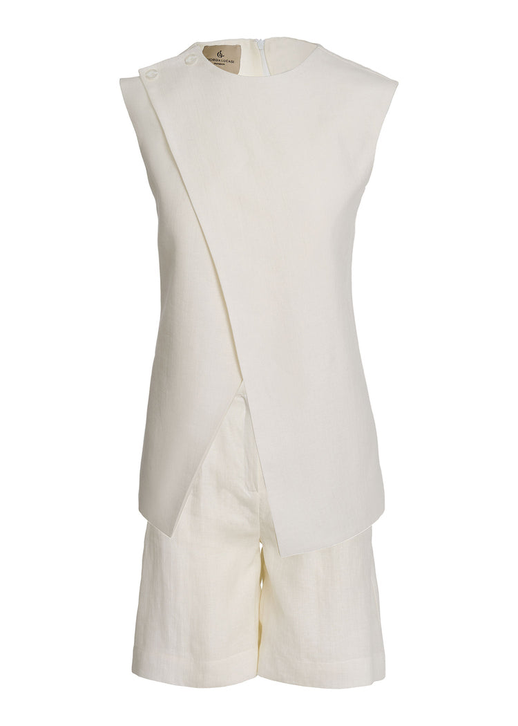 - A bold and modern two-piece set featuring an asymmetrical sleeveless top and tailored Bermuda shorts, crafted from high-quality European linen.